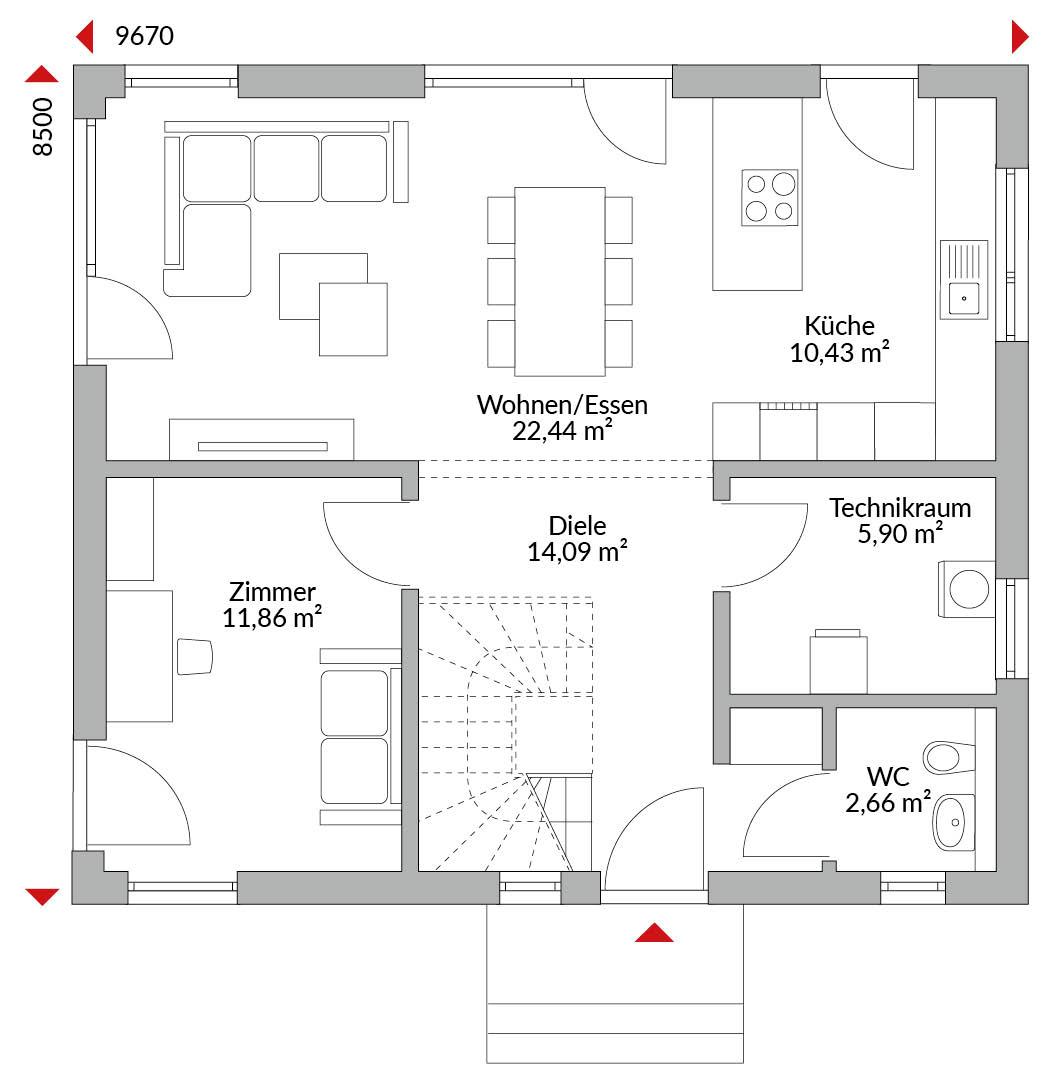 Zweigeschossige Stadtvilla mit vier Zimmern, offener Küche und geräumigem Wohn-/Essbereich, Bad, Gäste-WC, Technikraum und Diele, Zeltdach mit 22° Dachneigung.