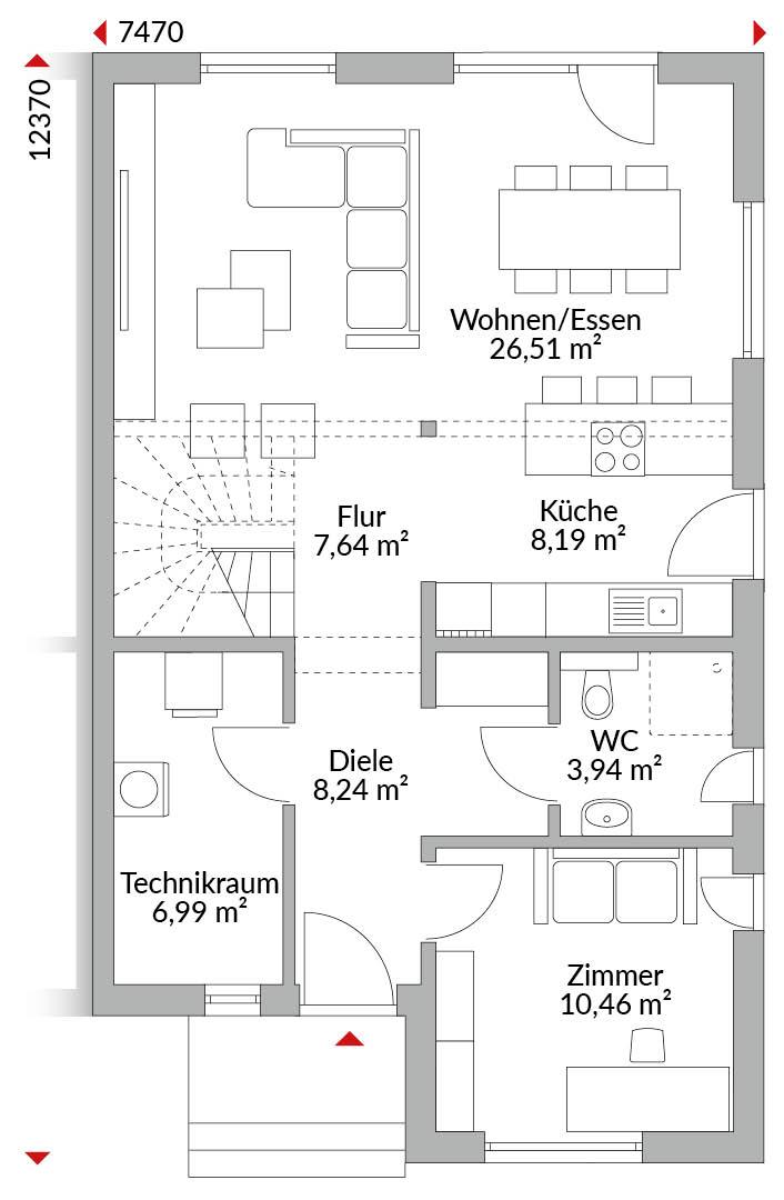Eineinhalbgeschossige Doppelhaushälfte mit fünf Zimmern, Ankleide, Küche, Bad, Gäste-WC, Technikraum und Diele. Satteldach mit 30° Dachneigung, Kniestock 1,50 m. Vorbau mit Flachdach.