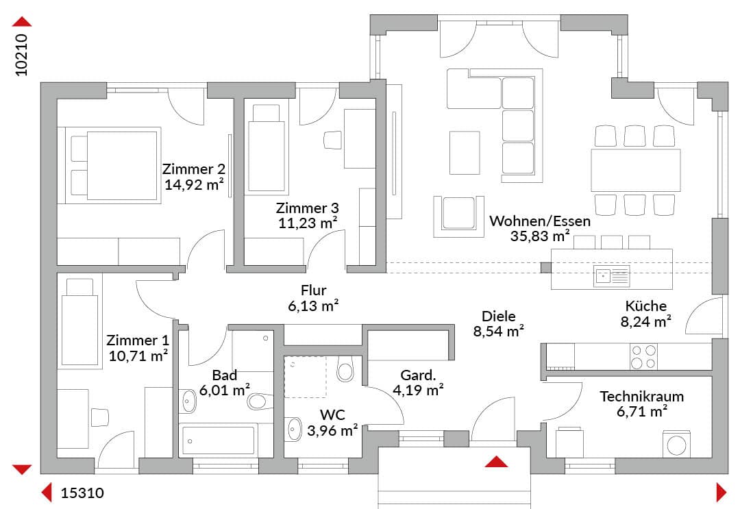 Bungalow mit vier Zimmern, offener Küche, Bad, Gäste-WC, Technikraum, Flur, Garderobe und Diele. Satteldach mit 22° Dachneigung.
