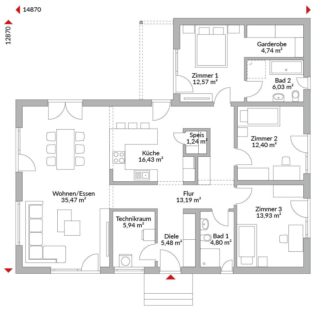 Winkelbungalow mit 4 Zimmern, Ankleide, En-Suite-Bad, offener Küche, Speisekammer, Gäste-Duschbad, Diele, Flur und Technikraum. Im Wohnbereich offen bis zum Dachfirst. Satteldach mit 22° Dachneigung inkl. kleiner Terrassenüberdachung.