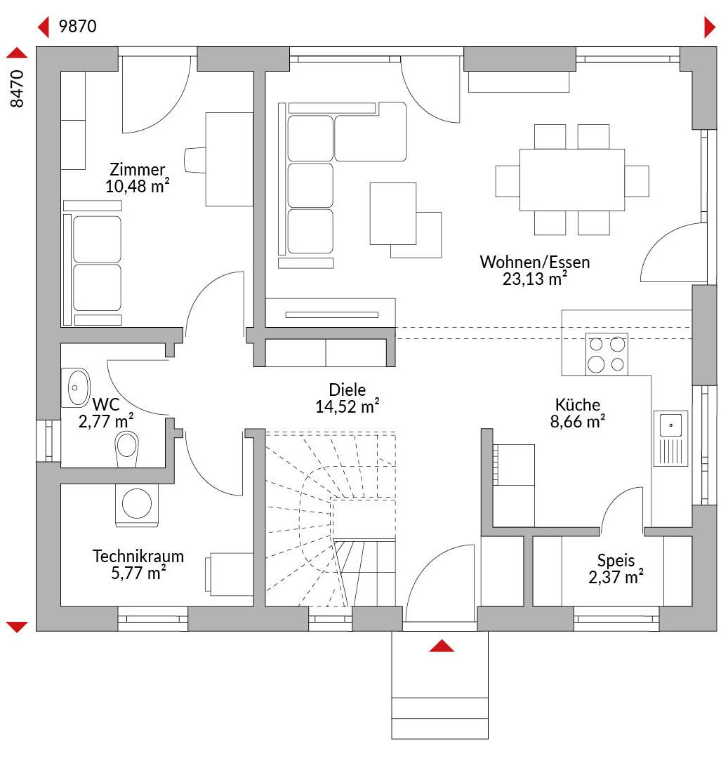 Eineinhalbgeschossiges Haus mit 5 Zimmern, offener Küche, Speisekammer, Bad, Gäste-WC, Diele, Flur und Technikraum. Satteldach mit 40° Dachneigung. Kniestock 1,00 m.