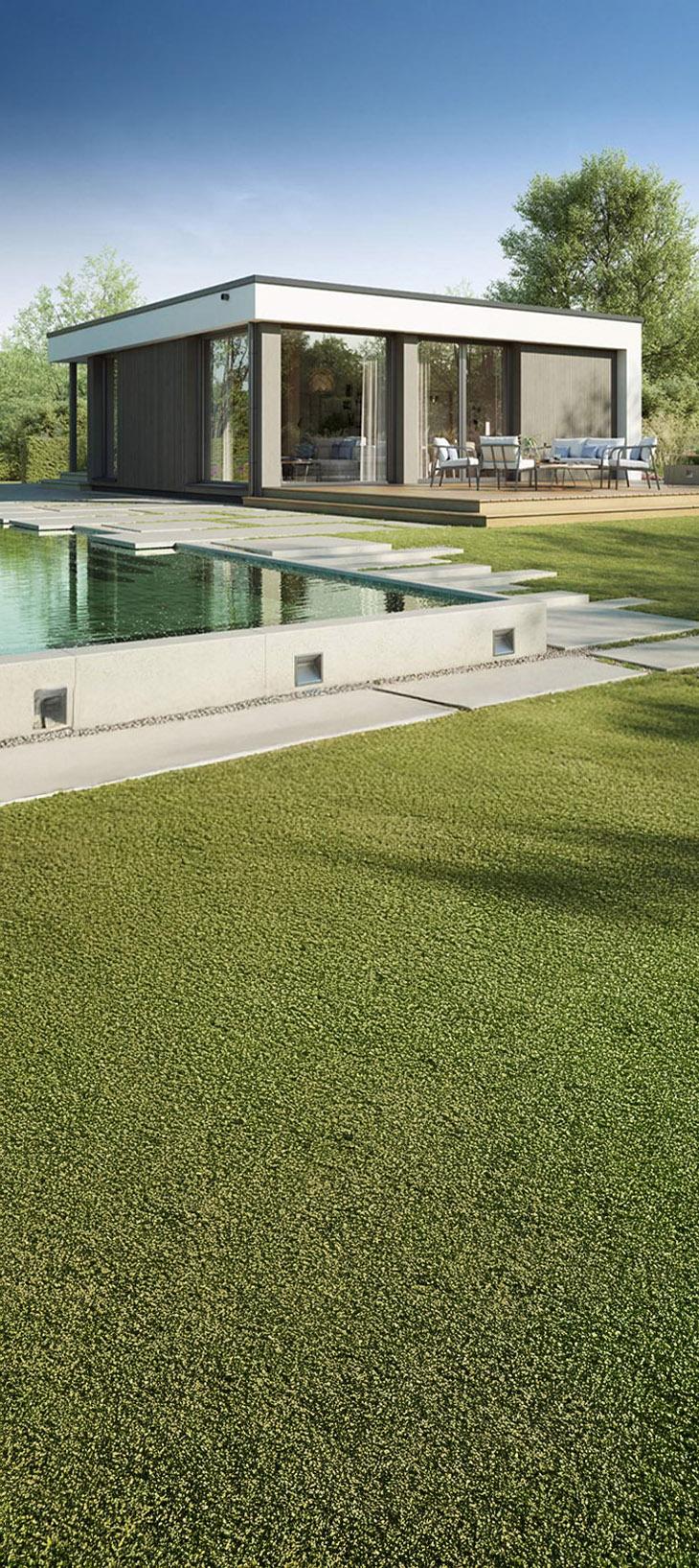 In Poing offenbart ein modular errichteter Bungalow, welch großartige Lösungen die Bauweise ermöglicht. Wandbreite und raumhohe Panoramafenster fluten die Räume des Musterhauses mit Tageslicht und schaffen phantastische Sichtachsen. Dieses beeindruckende Raumgefühl muss man live erleben! Das smarte Musterhaus zeigt, dass der Modulbau höchsten Ansprüchen an Design, Komfort und Energieeffizienz gerecht wird.