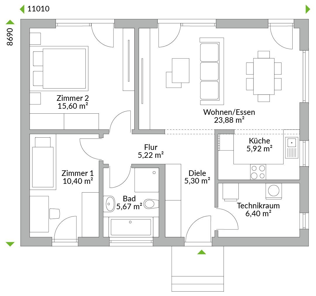 Klein, fein, mein: Dieser moderne Bungalow für Paare, Singles oder die Minifamilie punktet mit großen Fenstern, viel Tageslicht und einem überzeugenden Grundriss. Pflegeleicht ist er eine echte Alternative zur Mietwohnung. Auch als Zweitwohnsitz oder Ferienhaus genießt man mit dem Family 78 alle Vorzüge. Die mehrfarbige Fassade macht unser kleinstes Haus zum Hingucker - egal, wo er gebaut wird.