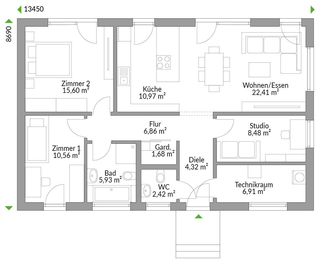 Drei Grundrissvarianten stehen zur Wahl… In jedem Falle ist man mit diesem Bungalow im Alter oder als Kleinfamilie up-to-date. Die durchdachten Raumaufteilungen gewährleisten individuelle Freiräume eines jeden Bewohners genauso wie die vielfältigen Möglichkeiten, mit Freunden und Familie zusammen zu sein. Bis zu drei Zimmer zur individuellen Verfügung ermöglichen auch ein Homeoffice, Platz für Hobbys oder Gästezimmer. Bodentiefe Fenster schaffen schöne Blickachsen in den Garten.