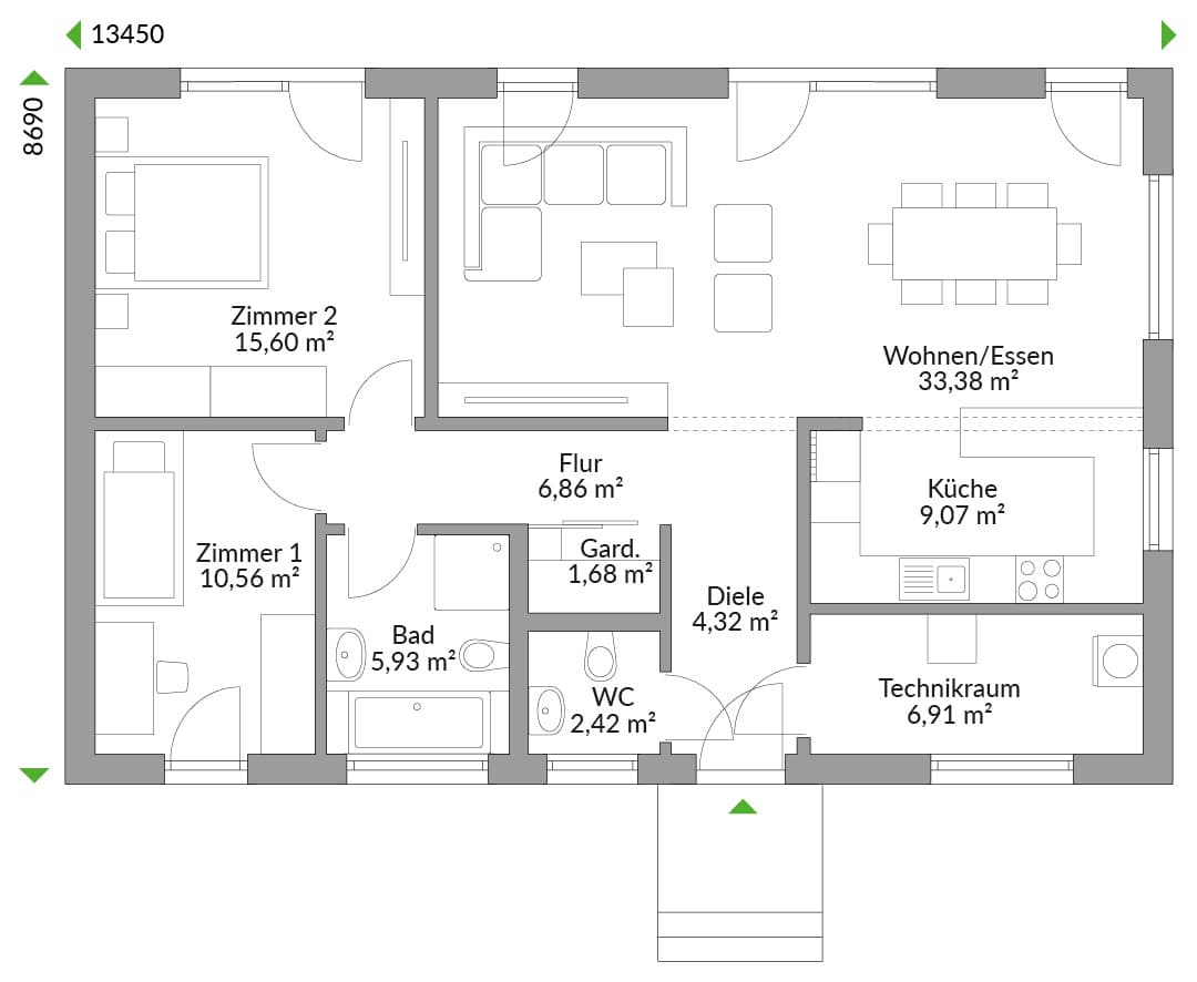 Drei Grundrissvarianten stehen zur Wahl… In jedem Falle ist man mit diesem Bungalow im Alter oder als Kleinfamilie up-to-date. Die durchdachten Raumaufteilungen gewährleisten individuelle Freiräume eines jeden Bewohners genauso wie die vielfältigen Möglichkeiten, mit Freunden und Familie zusammen zu sein. Bis zu drei Zimmer zur individuellen Verfügung ermöglichen auch ein Homeoffice, Platz für Hobbys oder Gästezimmer. Bodentiefe Fenster schaffen schöne Blickachsen in den Garten.