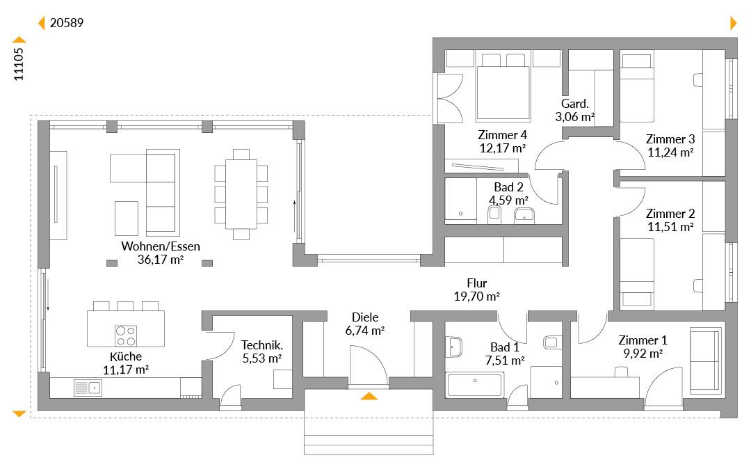 Den besten Platz an der Sonne müssen Sie nicht länger suchen! Umschlossen von zwei Baukörpern und dem Verbindungstrakt liegt quasi inmitten dieses Hauses ein schöner überdachter Freiplatz. Diese Wohlfühl-Oase macht den puristisch-eleganten Flachdachbungalow mit seiner schönen Fassadengestaltung vollkommen.