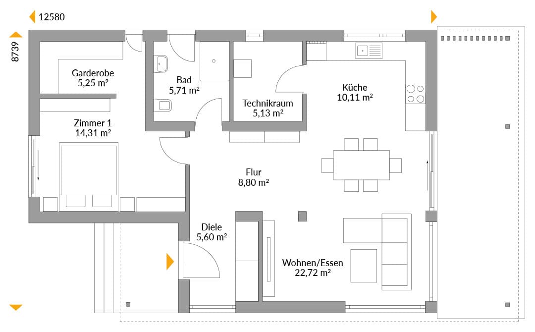 Next 80 FT verlängert Ihre Outdoor-Saison: Eine ganze Hausseite ist großzügig überdacht und schützt Ihren Terrassenplatz nicht nur vor zu viel Sonne, sondern auch vor kurzen Regenschauern. Sitzpolster können hier übernachten und Terrassenmöbel überwintern. Und falls Sie Ihr Flachdach begrünen möchten, ist das ein kleiner, aber schöner Beitrag zum Klimaschutz.