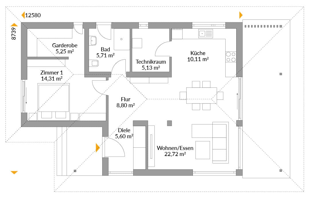 Die großzügige Dachlandschaft behütet Ihren hochmodernen Lebensraum und bietet Ihnen neben Stauraum im Dachboden eine schützende Terrassenüberdachung samt schattenspendender und windbrechender Lamellen-Seitenwand. So können Sie Ihren Speisesalon während vieler Wochen des Jahres nach draußen verlegen und zum guten Essen den Duft von Blumen genießen.