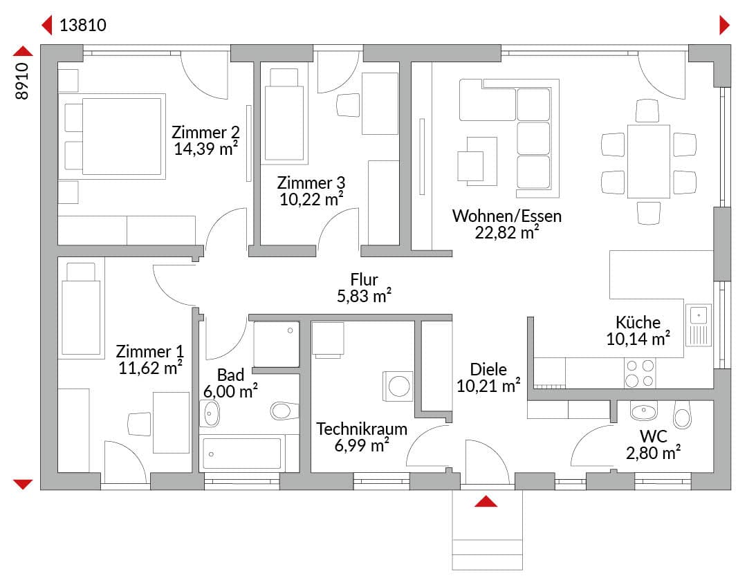 Bungalow mit 4 Zimmern, offener Küche, Bad, Gäste-WC, Technikraum und Diele. Walmdach mit 25° Dachneigung.