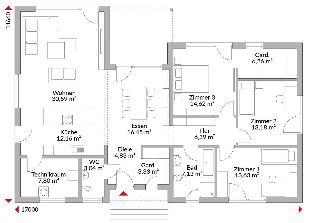 Bungalow mit vier Zimmern, Ankleide, Garderobe, offener Küche, Bad, Gäste-WC, Technikraum, Diele und Flur. Integrierte Eingangs- und Terrassenüberdachung. Walmdach mit 25° Dachneigung.