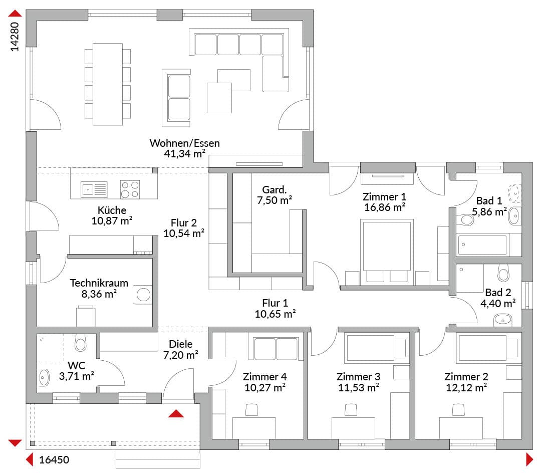 Winkelbungalow mit fünf Zimmern, Ankleide, offener Küche, zwei Bädern, Gäste-WC, Technikraum, Diele und zwei Fluren. Integrierte Eingangsüberdachung. Satteldach mit 22° Dachneigung.