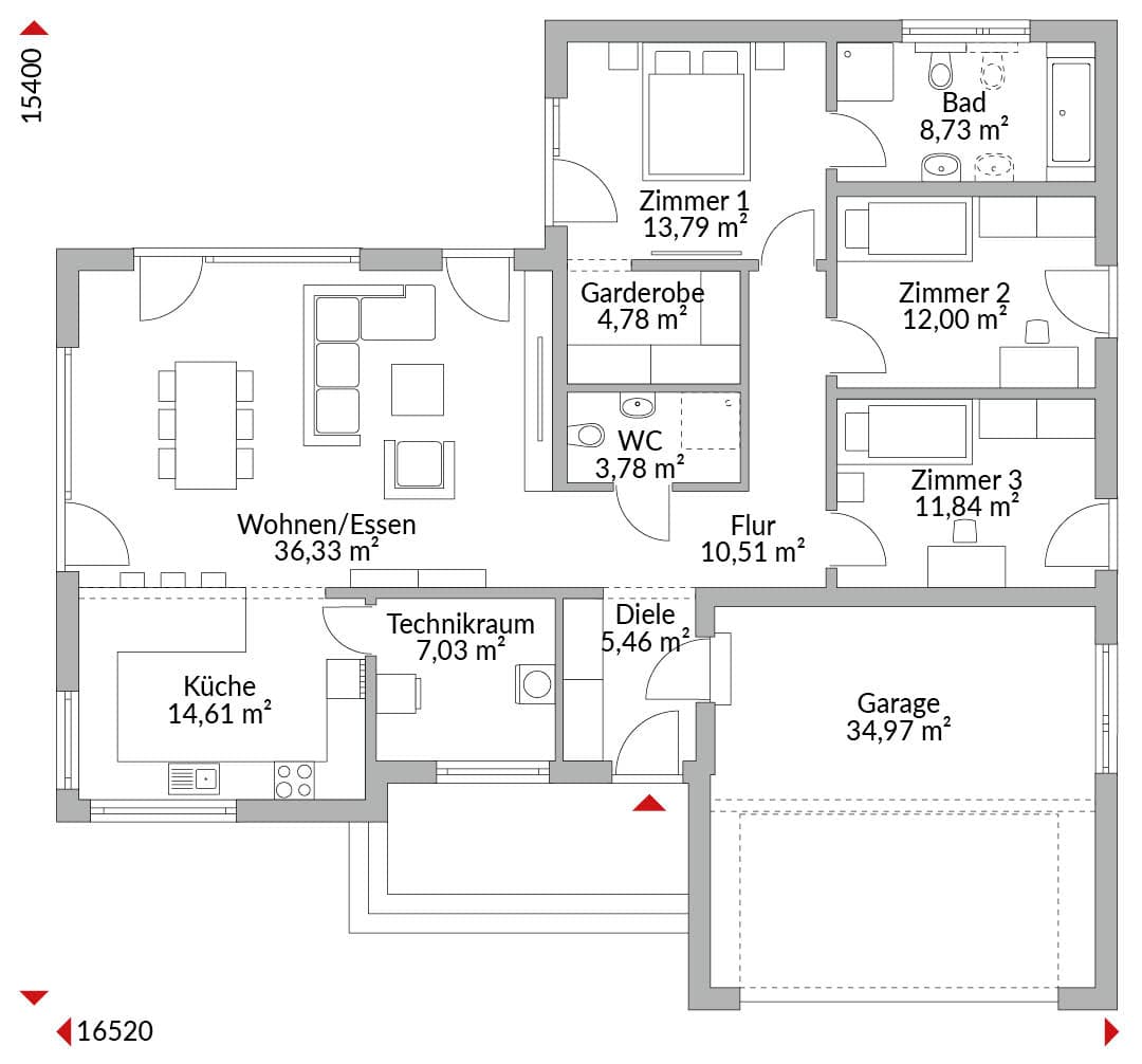 Winkelbungalow mit integrierter Garage, vier Zimmern, Ankleide, offener Küche, Bad, Gäste-WC, Technikraum, Diele und Flur. Integrierte Eingangsüberdachung. Walmdach mit 25° Dachneigung.