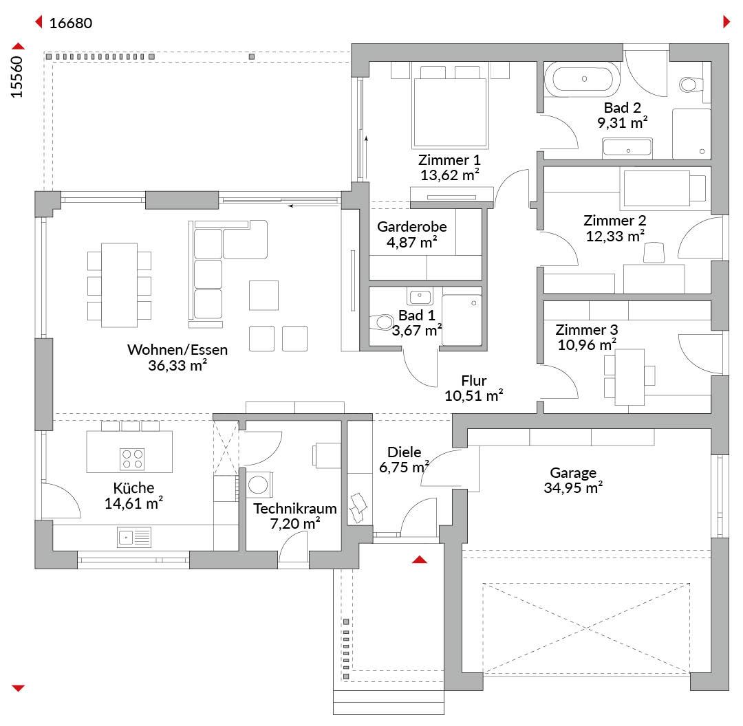 Winkelbungalow mit überdachtem Eingangsbereich der höheren Haustür und integrierter Garage. Garage von innen und außen begehbar. Überdachte Terrasse, erreichbar über Terrassenschiebetür im Wohnzimmer. Das höhere Erdgeschoss mit seinen höheren Fenstern ist als offenes Wohnen/ Essen mit anschließender Küche konzipiert. Technikraum, von Küche und außen begehbar. Diele, Flur, Gäste-WC, drei Schlafzimmer, davon eines mit Bad-en Suite und begehbarer Ankleide. Walmdach mit breiten Dachüberständen von 80 cm, Dachneigung 22°.