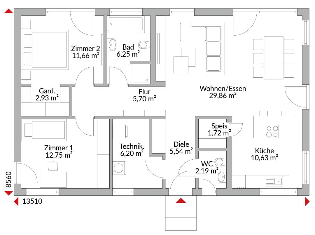 Bungalow mit drei Zimmern, offener Küche, Bad, Gäste-WC, Technikraum und Diele. Satteldach mit 22° Dachneigung.