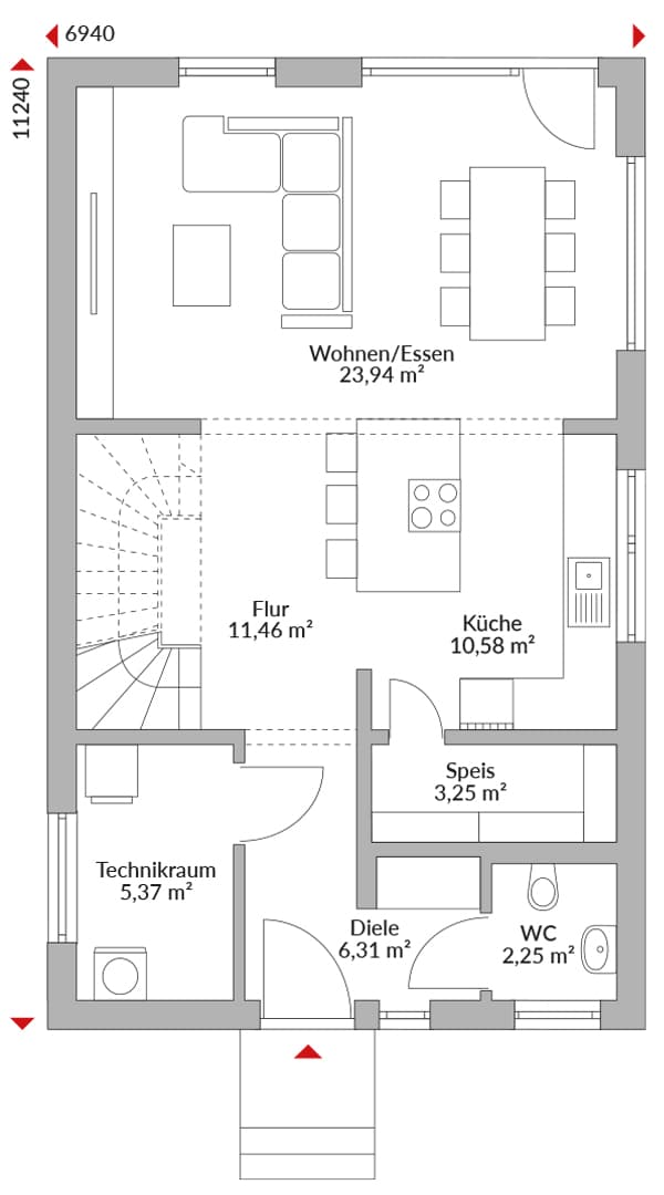 Eineinhalbgeschossiges Haus mit 4 Zimmern, 2 Ankleiden , offener Küche, Speisekammer, Bad, Gäste-WC, Diele, Flur. und Technikraum. Satteldach mit 40° Dachneigung. Kniestock 1,50 m.