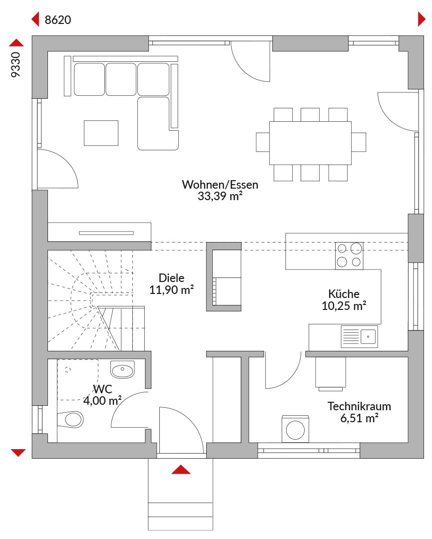 Eineinhalbgeschossiges Haus mit vier Zimmern, offener Küche, Bad, Gäste-WC, Technikraum und Diele, Satteldach mit 40° Dachneigung, Kniestock 0,75 m.
