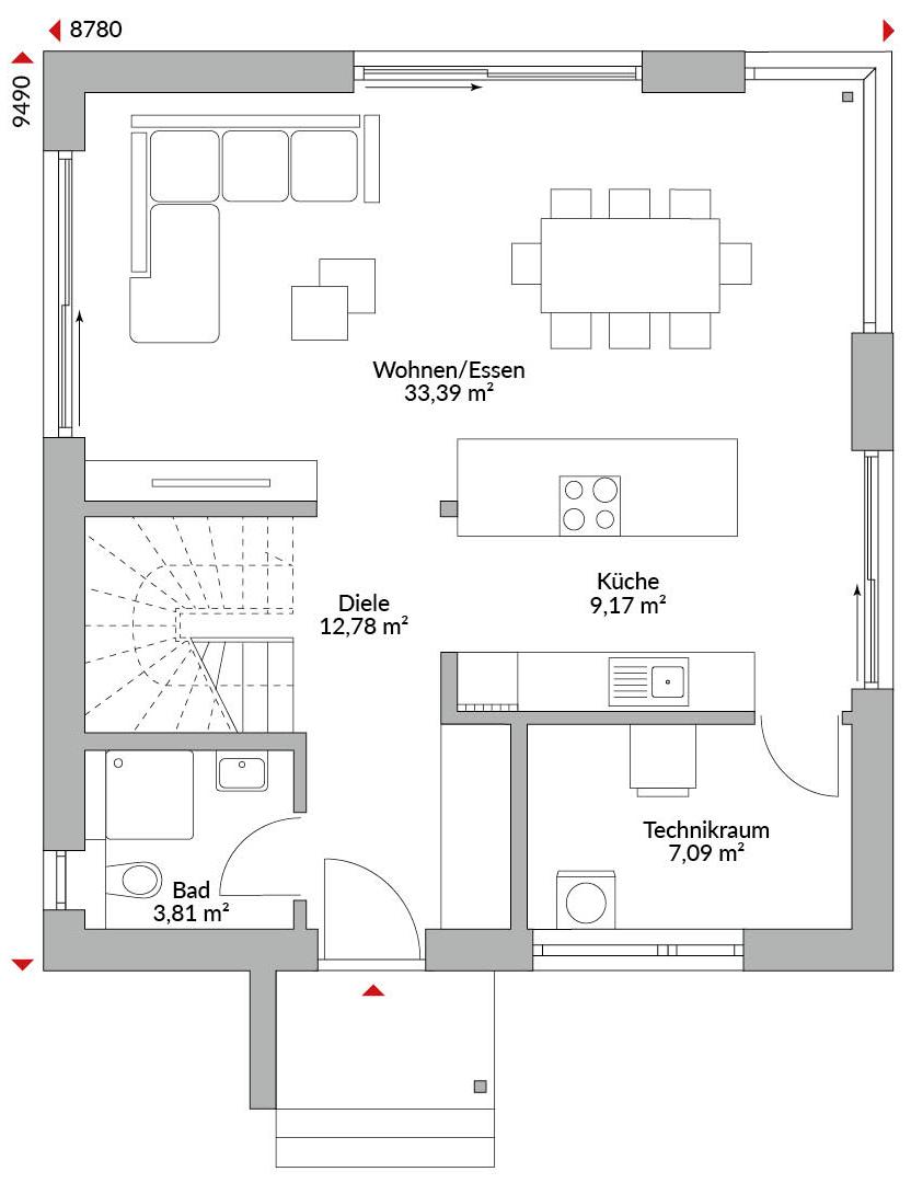 Eineinhalbgeschossiges Haus mit Eingangsüberdachung der höheren Haustür und zwei Zimmern im Obergeschoss. Hauptschlafzimmer mit großer Ankleide. Das erhöhte Erdgeschoss mit Eckverglasung und höheren Fenstern ist als offene Küche/ Wohnen/ Essen mit Schiebetüren zur Terrasse konzipiert. Gäste-WC mit Dusche, Wannenbad mit Dusche und Doppelwaschbecken, Technikraum und Diele, Flur, Satteldach mit breiter Traufe von 60 cm, 40° Dachneigung, Kniestock 1 m.
