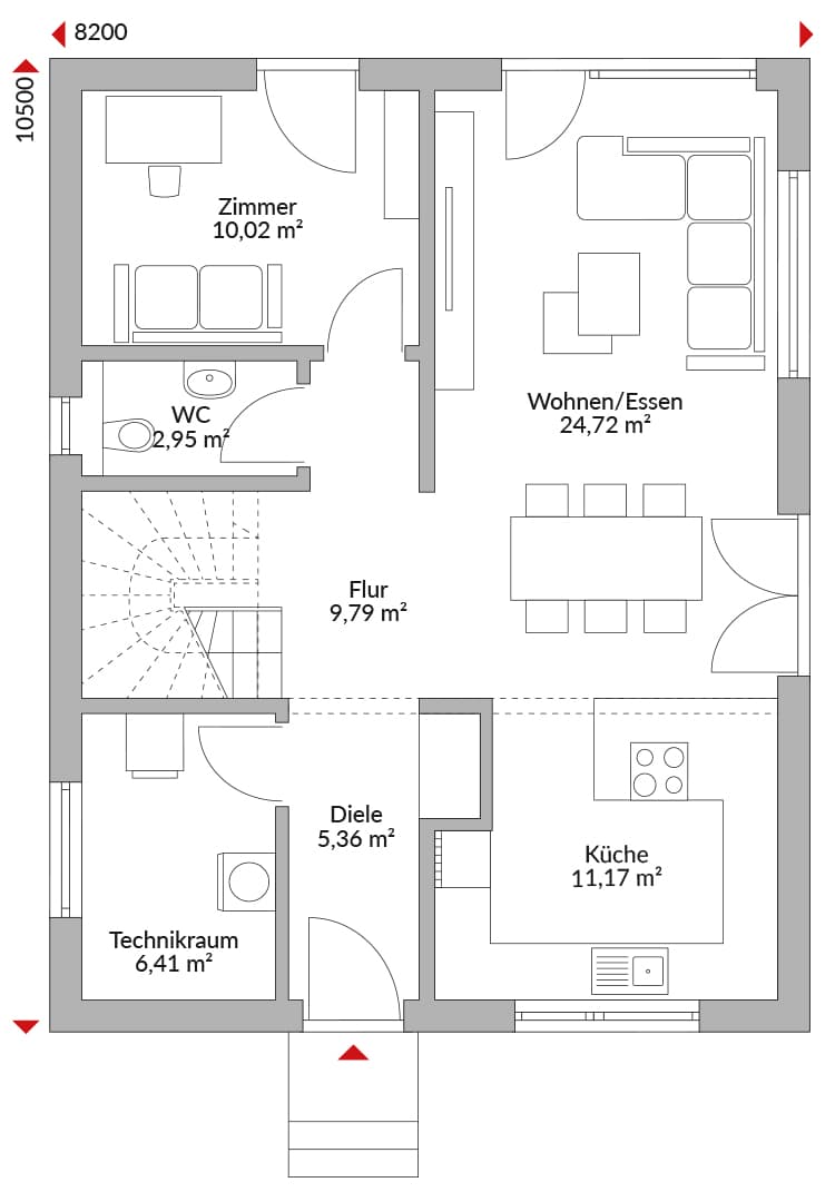 Eineinhalbgeschossiges Haus mit 5 Zimmern, Ankleide, offener Küche, Bad, Gäste-WC, Diele, Flur und Technikraum. Satteldach mit 40° Dachneigung. Kniestock 1,25 m.