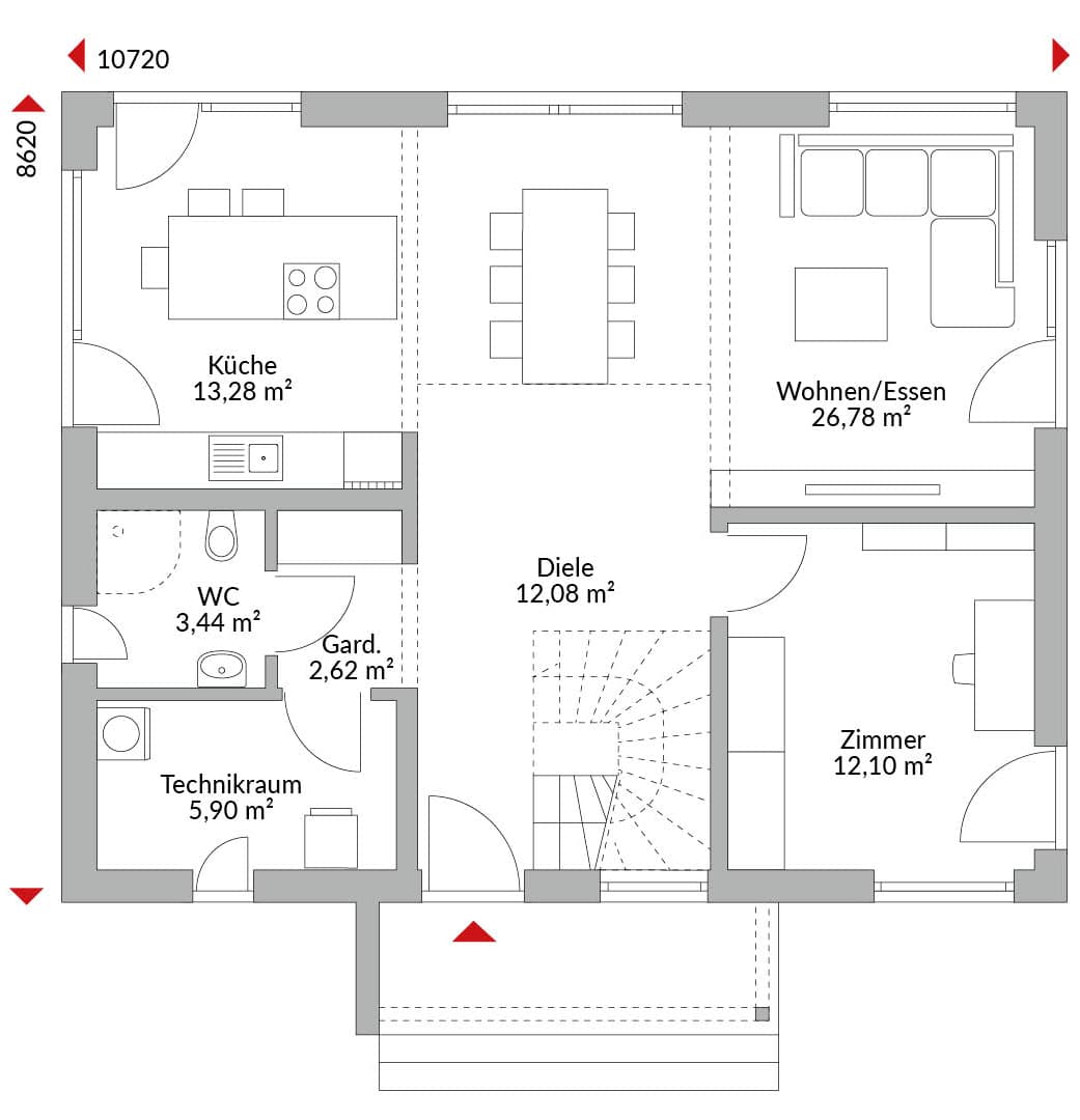 Haus mit fünf Zimmern, Attika-Eingangsüberdachung, offener Küche, Bad, Gäste-WC, Technikraum und Diele, Galerie, Satteldach mit 30° Dachneigung, Kniestock 1,75 m.