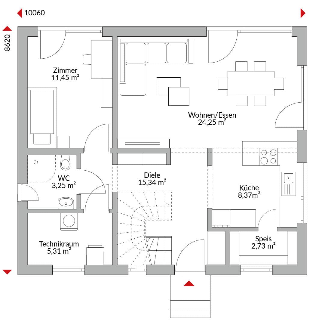 Eineinhalbgeschossiges Haus mit 5 Zimmern, offener Küche, Speisekammer, Bad, Gäste-WC, Diele, Flur und Technikraum. Satteldach mit 40° Dachneigung, Kniestock 0,75 m.