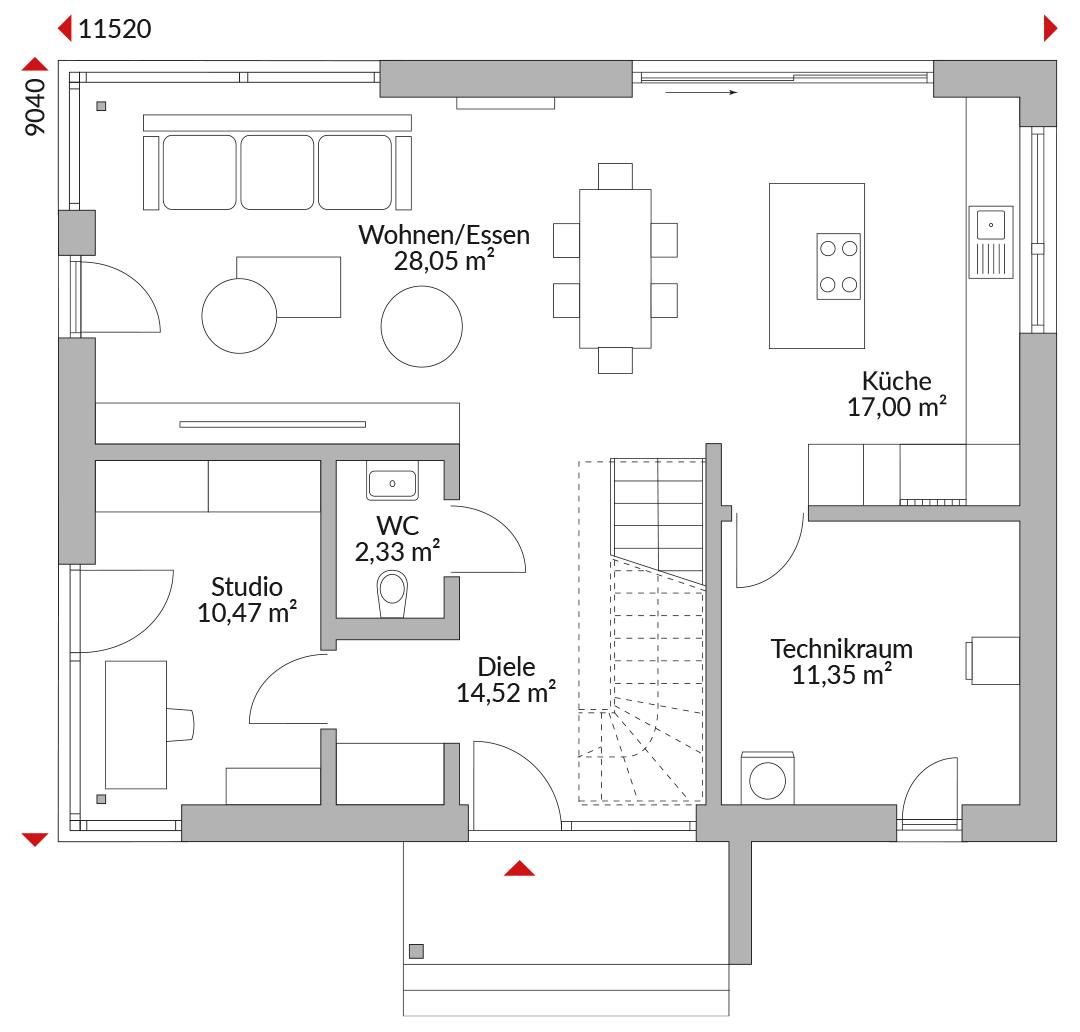 Eineinhalbgeschossiges Haus mit Eingangsüberdachung der höheren Haustür und drei Zimmern im Obergeschoss. Bodentiefe Verglasung im Erd- und Obergeschoss. Hauptschlafzimmer mit geräumiger Ankleide und Duschbad en Suite. Weiteres Wannenbad mit Dusche und Doppelwaschbecken im Obergeschoss. Das höhere Erdgeschoss mit verglastem Eckerker und erhöhter Verglasung ist als offene Küche/ Wohnen/ Essen mit Schiebetüren zur Terrasse konzipiert. Büro mit bodentiefer Eckverglasung, Gäste-WC, Technikraum und Diele mit Garderobe, Flur, Satteldach, 32° Dachneigung, Kniestock 2,00 m.