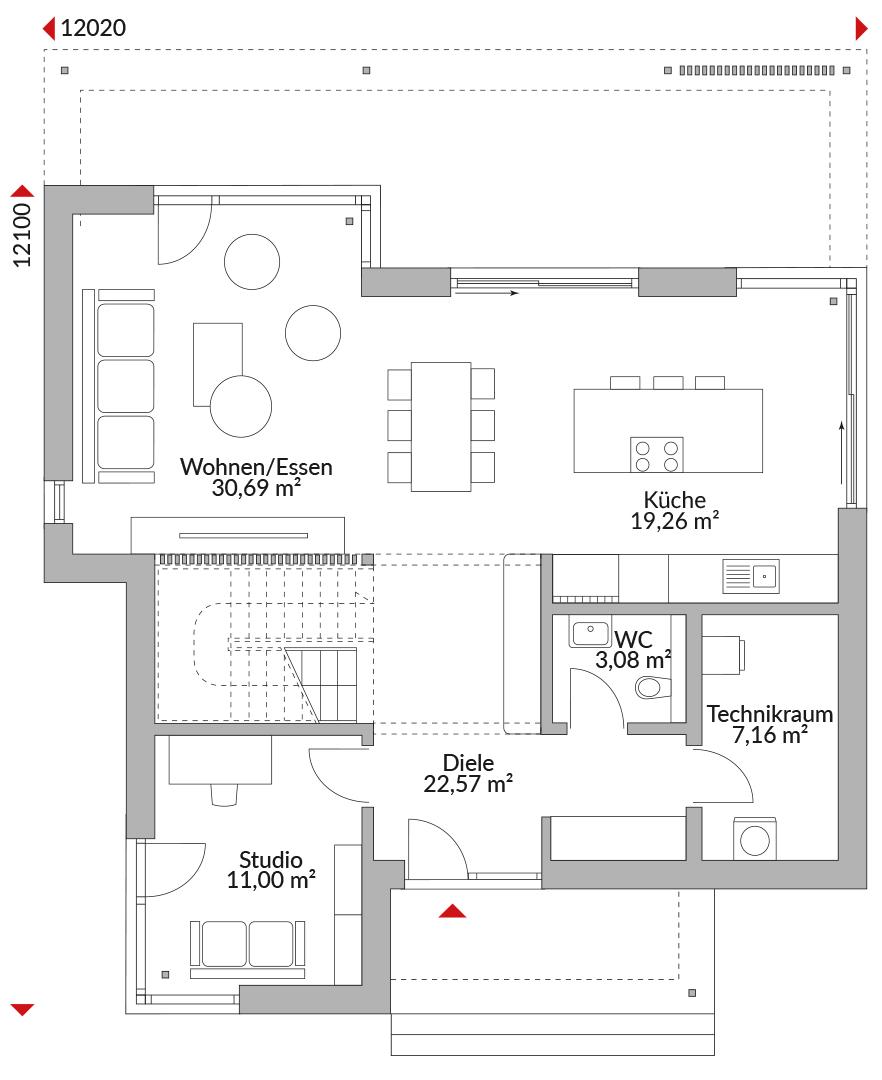 Eineinhalbgeschossiges Haus mit Eingangsüberdachung der höheren Haustür und drei Zimmern im Obergeschoss. Hauptschlafzimmer mit großer Ankleide und Duschbad en Suite. Ein Wannenbad mit Doppelwaschbecken im Obergeschoss. Das erhöhte Erdgeschoss mit Eckfensterverglasung und höheren Fenstern ist als offene Küche/ Wohnen/ Essen mit Schiebetüren zur Terrasse konzipiert. Zusätzliches Studio mit Eckfensterverglasung, Gäste-WC, Technikraum und Diele, Satteldach, 35° Dachneigung, Kniestock 1,80 m.
