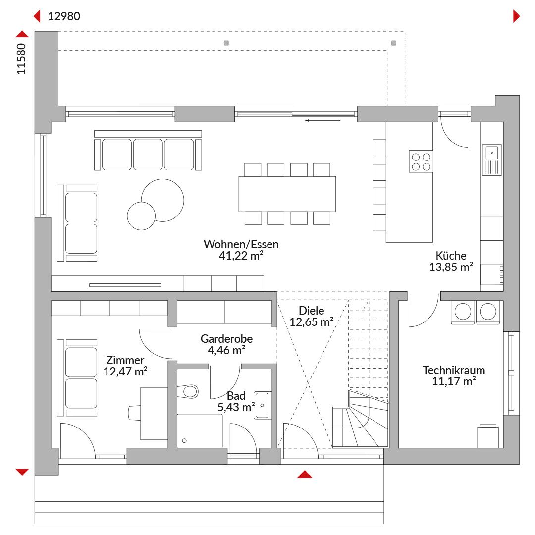 Eineinhalbgeschossiges Haus mit Eingangsüberdachung der höheren Haustür und drei Zimmern im Obergeschoss. Schlafzimmer mit begehbarer Ankleide und Masterbad inkl. Doppelwaschbecken und Dusche, geräumiger Flur mit Lesecke, Luftraum, zweites Bad im OG mit Badewanne und Doppelwaschbecken. Separates Mehrzweckzimmer im Erdgeschoss. Das höhere Erdgeschoss mit erhöhter bodentiefer Raumverglasung ist als offene Küche / Wohnen/ Essen mit Schiebetüren zur Terrasse konzipiert. Technikraum und Diele mit Garderobe, Gäste-WC. Satteldach, 38° Dachneigung, Kniestock 1,75 m.