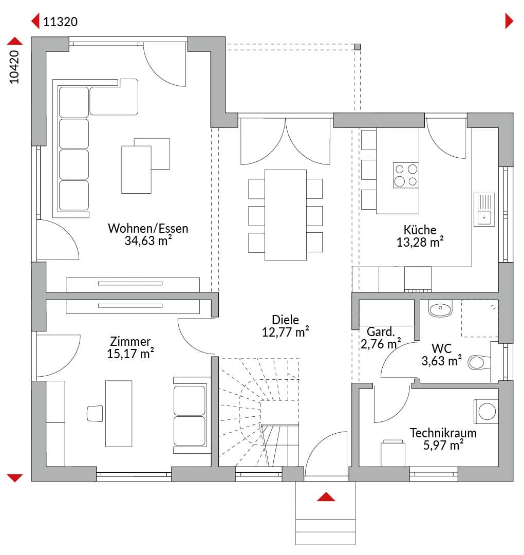 Eineinhalbgeschossiges Drei-Giebel-Haus mit 6 Zimmern, offener Küche, Bad, Gäste-WC, Garderobe, Diele, Flur, Ankleide und Technikraum. Satteldach mit 38° Dachneigung, Kniestock 1 m.