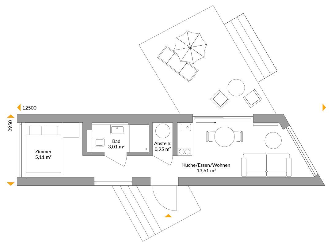 Frühmorgens mit den Vögeln erwachen, barfuß durch den Tau laufen und zuschauen, wie zaghafte Sonnenstrahlen mit den Nebelschwaden flirten. Nach einer Runde im See den ersten Kaffee des Tages genießen. Kurz nochmal ins Bett kuscheln, bis das Frühstück auf die sonnige Terrasse lockt. Gefällt Ihnen so ein Szenario? Unser Mini-Ferienhaus mit einem Schlafzimmer wäre eine schöne Basis dafür. Klein genug, dass es kaum Arbeit bereitet, groß genug für entspannte Auszeiten. Es ist Raum für eine Küchenzeile, dem komfortablen Duschbad fehlt es an nichts, und drei gläserne Panoramawände bieten einen herrlichen Ausblick.