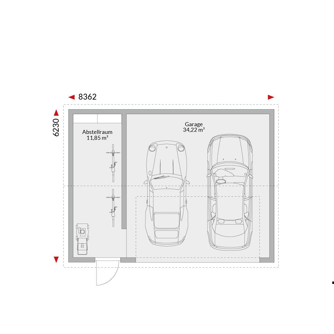 Doppelgarage mit Satteldach und Abstellraum Grundfläche gesamt: 46,07 m² Garage 34,22 m², Abstellraum 11,85 m² Außenmaße 8,362 m x : 6,23 m Tor und Tür traufseitig