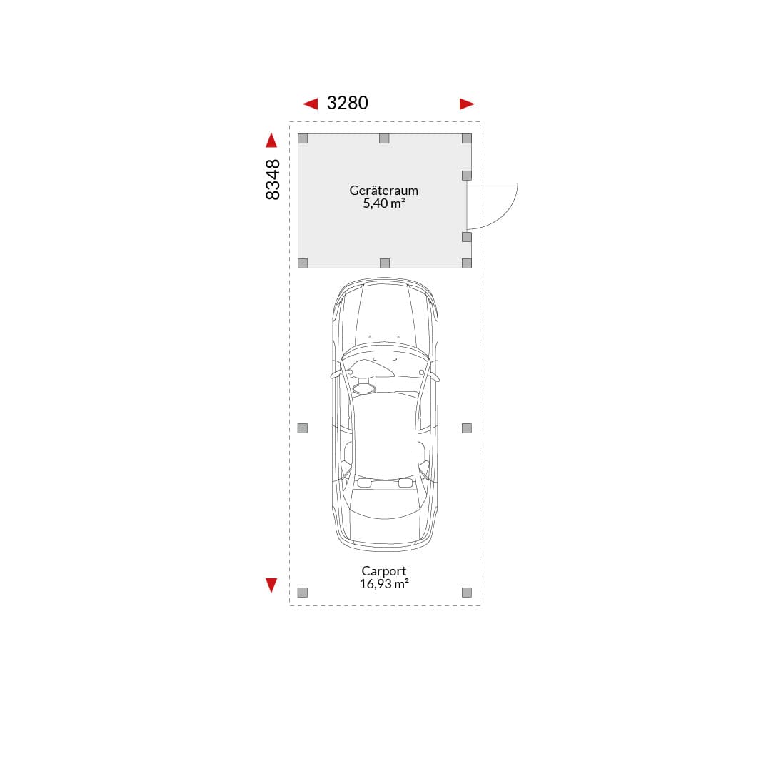 Einzelcarport mit Pultdach und Abstellraum Grundfläche gesamt: 22,33 m² Carport 16,93 m², Abstellraum 5,40 m² Außenmaße 3,016 m x 7,996 m