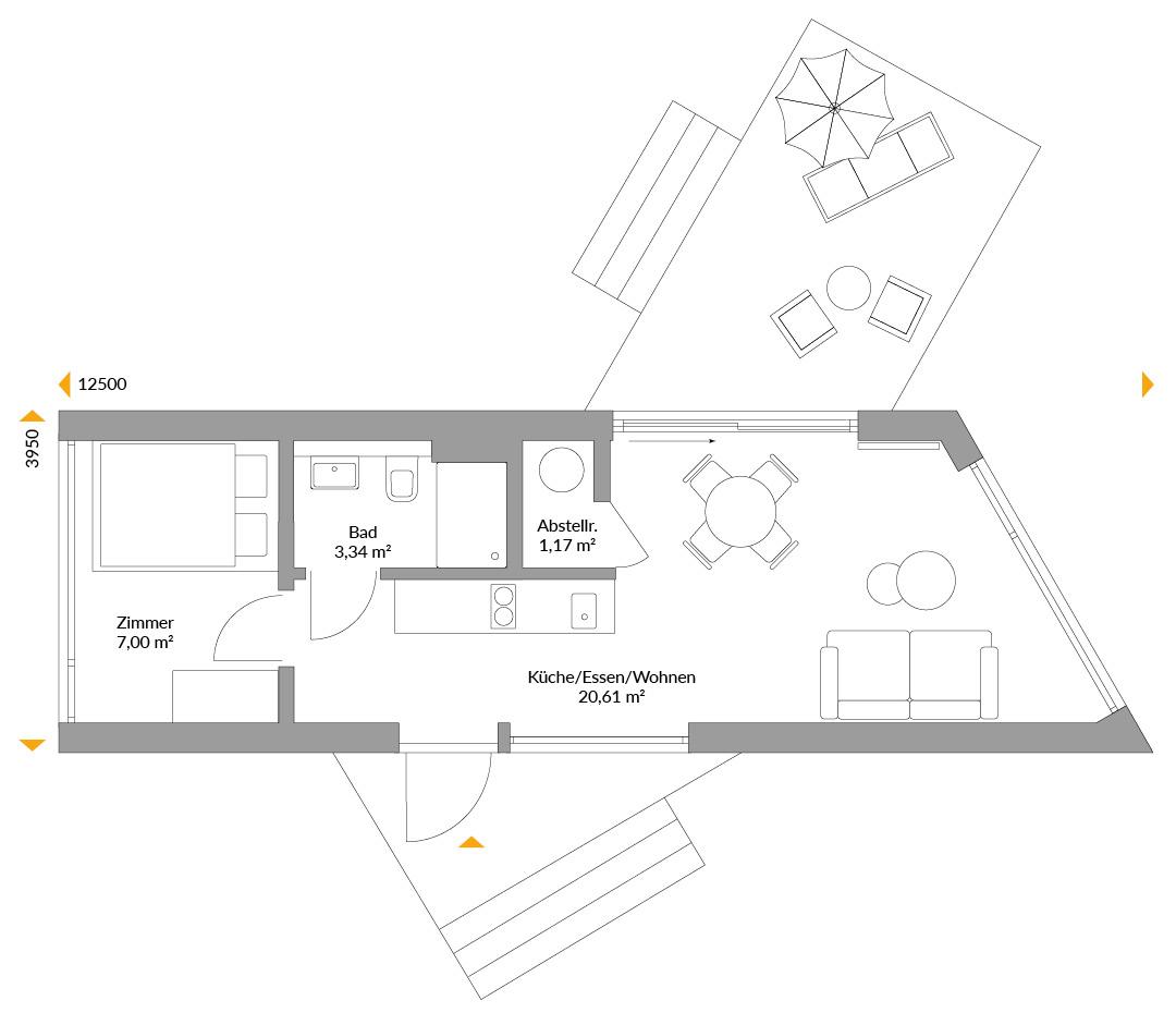 Entspannter wohnen als im Ein-Schlafzimmer-S-Modulhaus lässt es sich in dieser etwas größeren Variante. Bei dieser Version mit L-Modulen bringt ein Meter mehr Breite ganze neun Quadratmeter mehr Wohnfläche. Die machen sich im Schlafzimmer und vor allem im Wohn-/Essbereich bemerkbar. Hier könnten auch mal Gäste auf der Schlafcouch übernachten und Platz am Esstisch finden. Auch die Küchenzeile und die Panoramafenster fallen in der L-Version größer aus, so dass das minimalistische Kleinhaus durchaus als komfortable Single-Wohnung gelten kann.