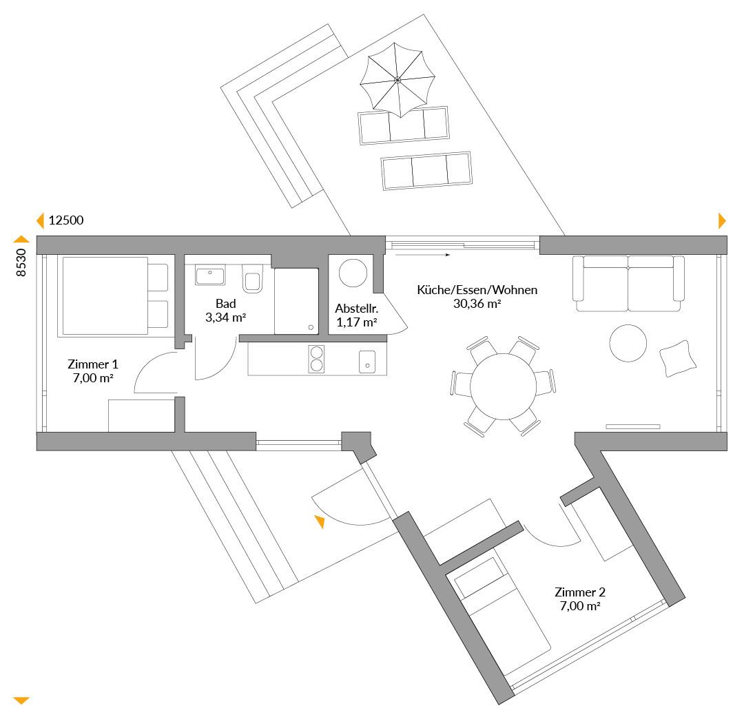 Für ein Mini-Haus bietet dieser Entwurf optimalen Wohnkomfort. Die breiten L-Module halten ein Platzangebot im Wohn-/Essbereich bereit, wie ihn manche Mietwohnung nicht bietet. Ganze 30 Quadratmeter laden zu zum Essen und Relaxen ein. Auch die Küchenzeile kann hier mithalten, Jeder Raum bietet einmalige Ausblicke durch die wandfüllenden Panoramafenster. Perfekt als Wohnhaus für Zwei oder Urlaubs- und Wochenendrefugium für die kleine Familie.