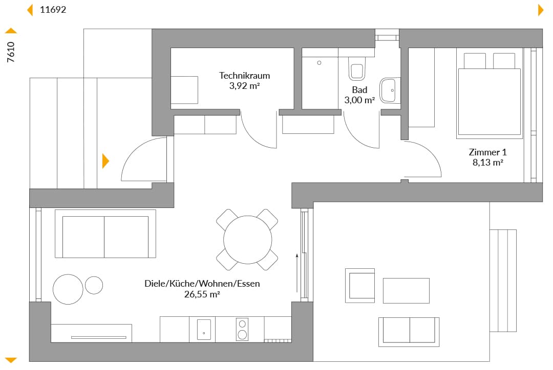 Elegant ums Eck geplant, bietet diese Form parallel aneinandergesetzter Module auf kompakter Fläche neben knapp 42 Quadratmetern zum Wohnen auch zwei windgeschützte Terrassenflächen. Sowohl der Hauseingang im Winkel als auch die von zwei Seiten umschlossene Sonnenterrasse bewähren sich in der Praxis. Im Mini-Haus sind alle Bereiche auf ihre wesentlichen Funktionen fokussiert, und dennoch wirken sie dank der großen Panoramafenster luftig.