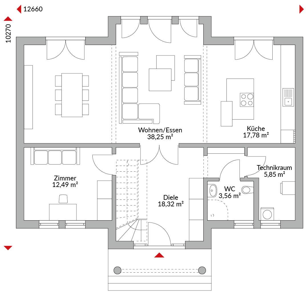 Zweigeschossiges Haus mit vier Zimmern, offener Küche, geräumigem Wohn-/Essbereich, Gäste-WC, Technikraum und Diele, Bad und zwei Ankleiden im Obergeschoss, Walmdach mit 22° Dachneigung.