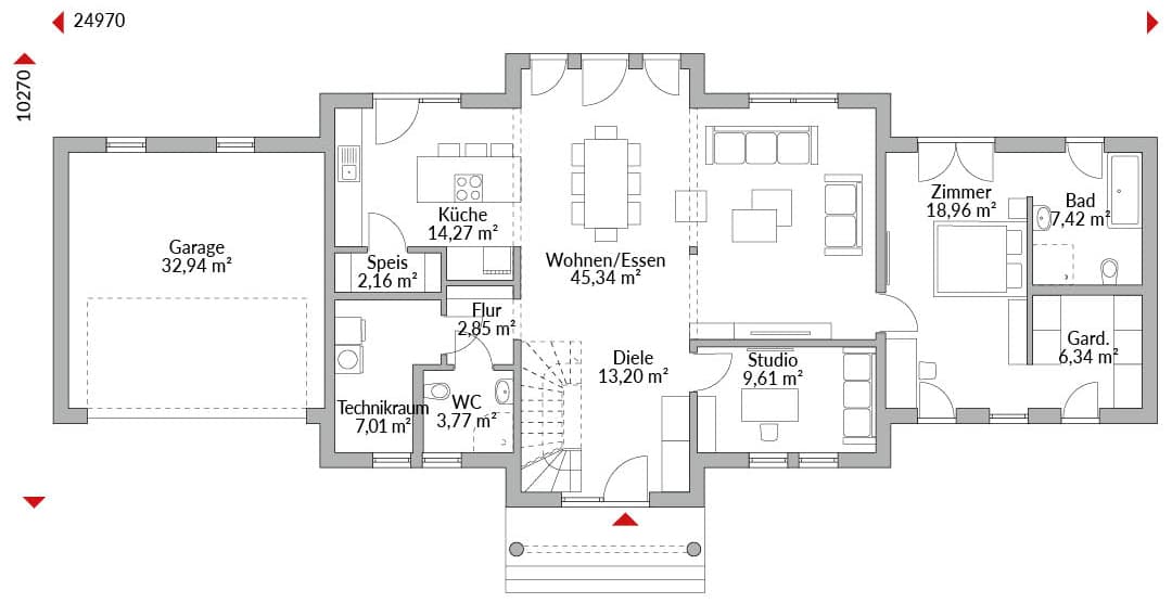 Zweigeschossiges Haus mit fünf Zimmern und Studio, offener Küche, Speisekammer, geräumigem Wohn-/Essbereich, Gäste-WC, Bad und Ankleide im Erdgeschoss, Technikraum und Diele, Bad im Obergeschoss, Balkon, integrierter Garage, Walmdach mit 22° Dachneigung.