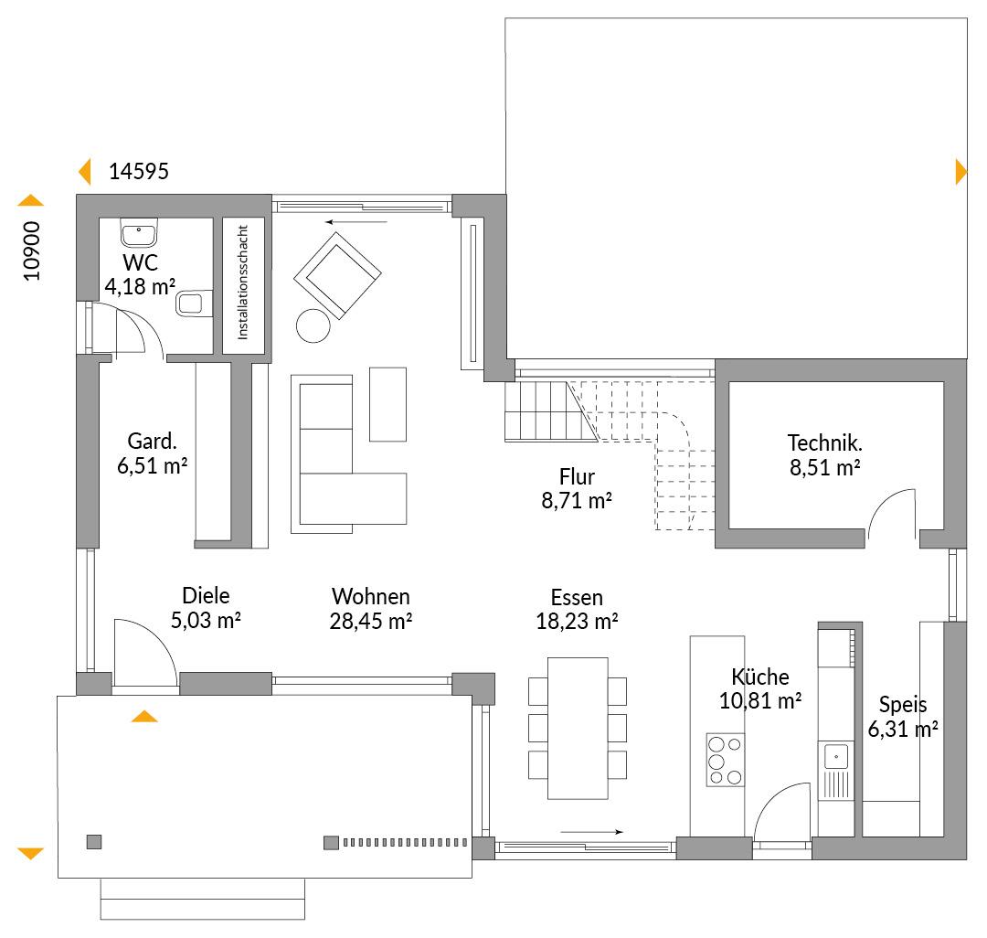 Das Walmdach wirkt wie ein Weichzeichner über den klaren Formen der versetzten Hausmodule. Ein großer Eckbalkon lädt zum Ausschauhalten nach dem Aufstehen ein und ist gleichzeitig Schutz für den darunterliegenden Hauseingang. Dieser Eingangsbereich erstreckt sich bis vor die großen Panoramafenster des Wohn-/Essbereiches, wobei eine schöne Holzlamellenwand Sichtschutz bietet.