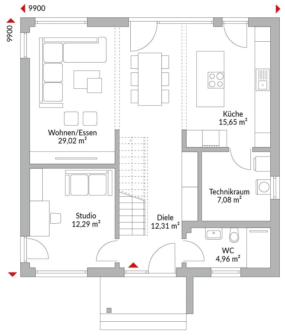 Praktisch gelöst: Der Technikraum begehbar von der Küche, ein zusätzliches WC mit Dusche sind nah am Eingang. So bleiben die Wege dennoch kurz, und das Haus bleibt aufgeräumt.