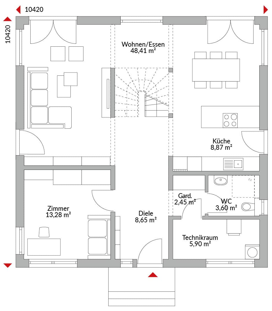 Zweigeschossige Stadtvilla mit fünf Zimmern, offener Küche, geräumigem Wohn-/Essbereich, Gäste-WC, Technikraum und Diele mit Garderobe, Bad und drei Ankleiden im Obergeschoss, Zeltdach mit 22° Dachneigung.