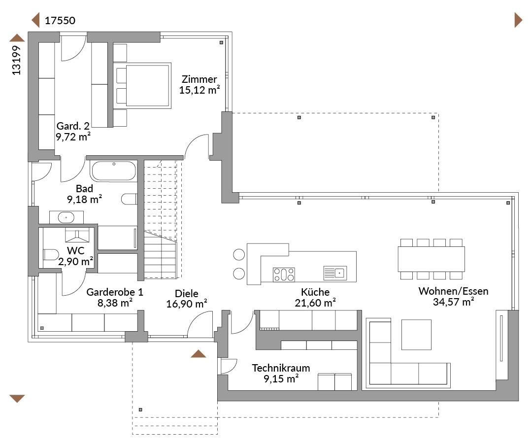 Er hat etwas majestätisches, dieser Prachtbau. Der mittlere Baukörper thront über allem, scheint über den Dingen zu schweben. Das gibt der Architektur Leichtigkeit und Harmonie und offenbart praktische Seiten – einen überdachten Eingang und eine überdachte Terrasse. Beides wissen Hausbesitzer im Alltag hoch zu schätzen.