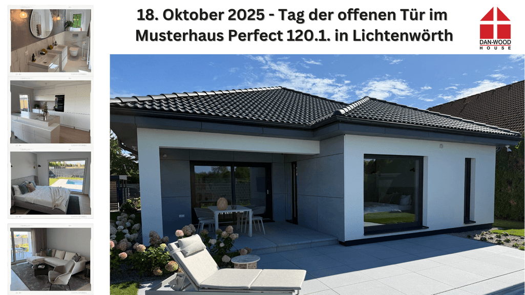 Das Danwood-Musterhaus östlich der Wiener Neustadt überzeugt außen mit klarer Linienführung, Putz-Holz-Fassade und überdachter Terrasse. Innen erwarten Sie ein heller, offener Wohn-Essbereich mit Designküche und Natursteinplatte, ein großzügiges Bad mit bodengleicher Dusche und Doppelwaschtisch, zwei Schlafzimmer sowie ein praktischer Technikraum. Auch der direkte Zugang zum Garten mit Pool verleiht dem Musterhaus besonderen Reiz.